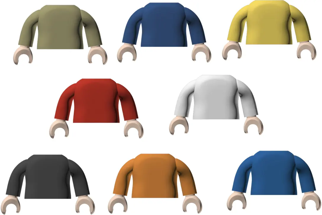 - 8x Oberkörper (unbedruckt) in den Farben: rot, schwarz, weiß, blau, orange, dunkelbau, khakigrün und gelb